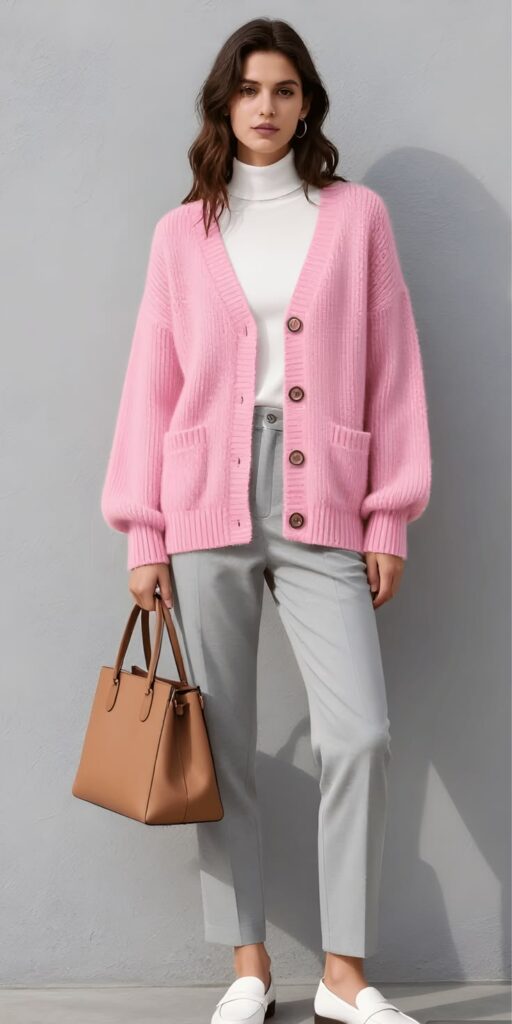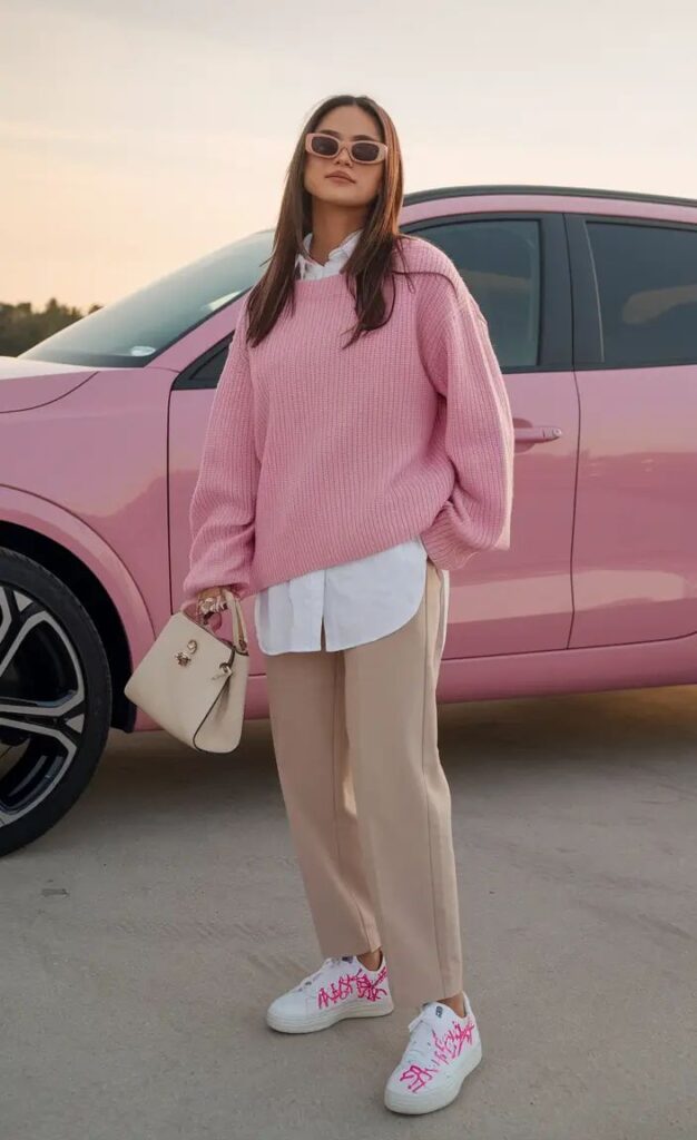 Pink oversized sweaters styled with leggings or straight-leg pants provide warmth and trendiness. Sneakers and minimal jewelry complete the look.