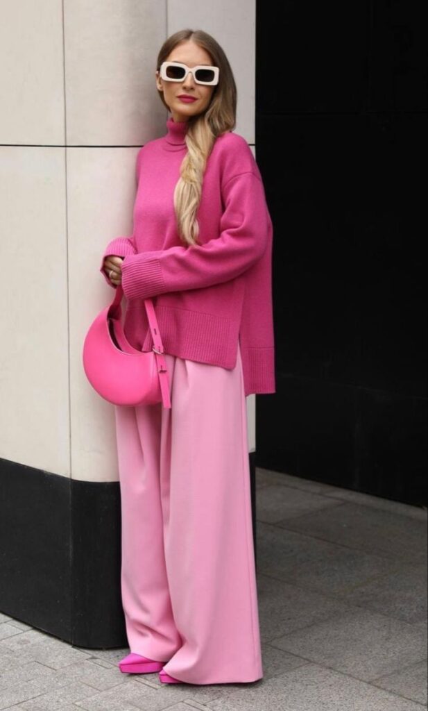 Oversized pink blazers paired with neutral trousers are trending. Pink knit dresses combined with boots create chic winter outfits. Coordinated pink sets simplify styling while maintaining sophistication.